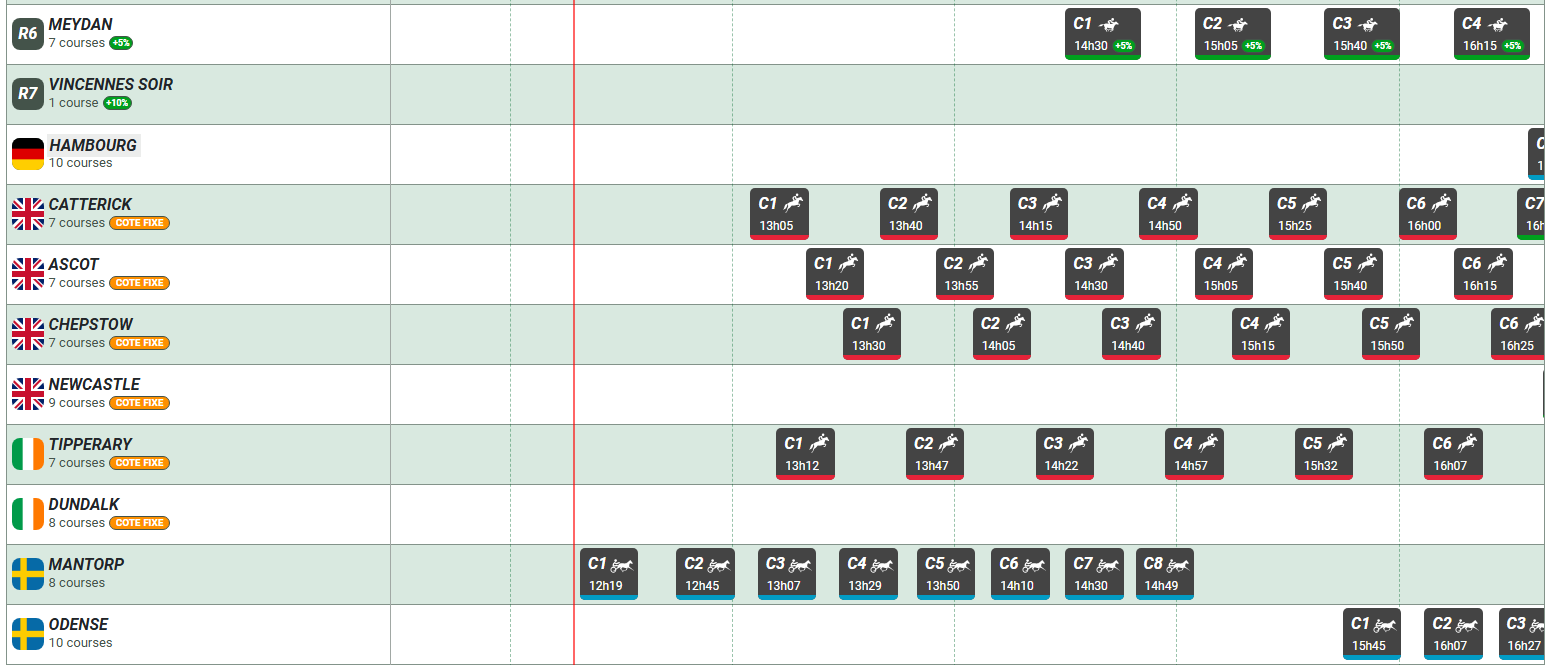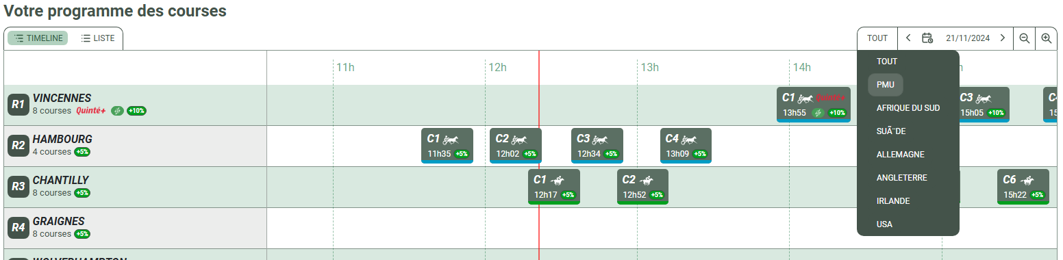 Om de bijeenkomsten in gemeenschappelijke massa met onze partners anders dan PMU weer te geven, zoals UK Tote, ATG, German Tote, Amerikaanse of Zuid-Afrikaanse races, vouw je de Tijdlijn uit met de knop linksonder op de Tijdlijn.